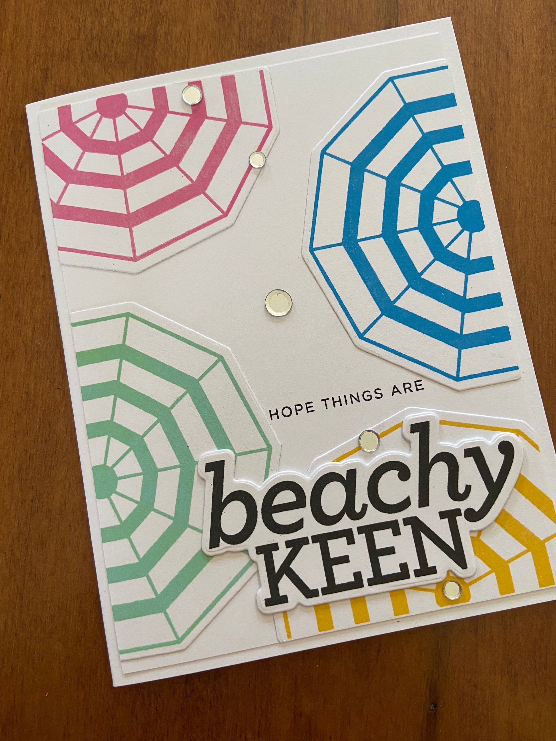 Convey your thoughtful sentiments to someone special with this "Hope things are Beachy Keen" card. Boasting brightly coloured graphic beach umbrellas, this card is stamped and die-cut, adding a dimensional depth to the design. Blank on the inside, it allows you to express your personal message.